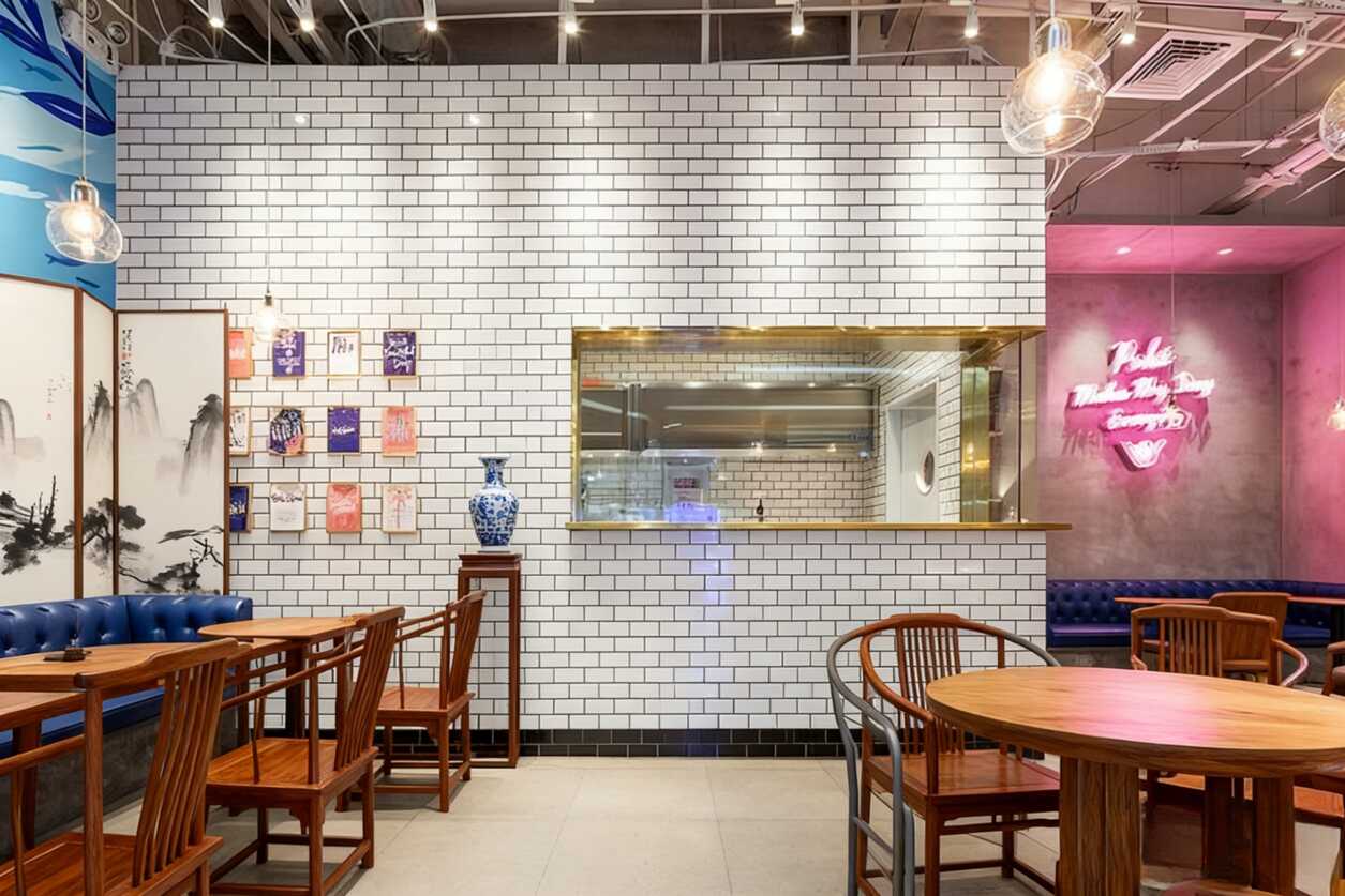 ***絕的是中間這個過渡處理!白色瓷磚墻打底,透明玻璃櫥窗讓后廚若隱若現,既保留了空間通透感又增添了些許神秘。墻上那組彩色裝飾畫***是點睛之筆,藍白花瓶帶著青花瓷的韻味,現代感和傳統元素碰撞得恰到好處。